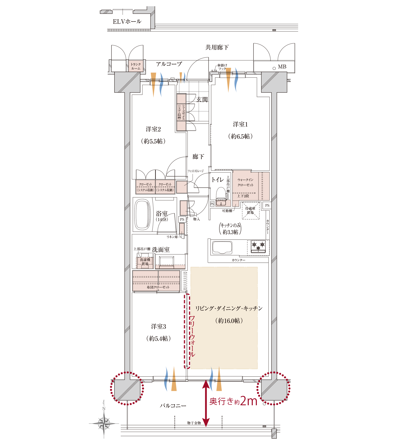 洋室3のフリーウォールを開放すれば、2部屋一体の広々とした約21.4帖に。