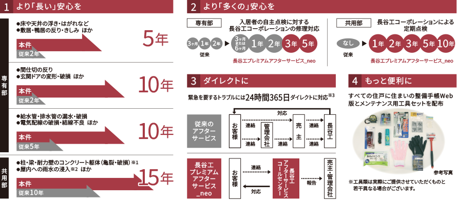 ※1:構造耐力上影響のあるもの(鉄筋のさび汁を伴った亀裂・破損及びこれに準じるものとし、毛細亀裂及び軽微な破損は除く)に限ります。※2:おおむね10年目に適切なメンテナンス(トップコート〔塗布防水・アスファルト防水〕塗布、シーリング補修、アスファルトルーフィング〔浮き・剥れ〕の補修、コーチングの打ち替え〔アスファルト防水〕、端部シールの打ち替え〔DN防水〕等)を行うことを条件に、期間を15年とします。※3:夜間や土・日・祝日・年末年始等の会社休業日は、アウル24センターにて受付いたします。※保証期間の詳細については係員等にお尋ねください。