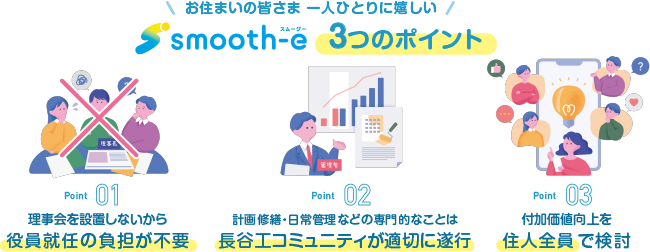 smooth-eは、そうした課題を解決するため、日常管理や煩雑な業務は専門家に任せ、パソコンやスマートフォンを使って組合員全員が気軽にマンション管理に関わることのできるマンション管理サービスです。